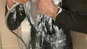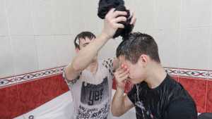 Ruslan continues to please us with his wet look and charge us with kindness and positive! He was dressed in blue jeans, a white T-shirt that enlightened the body when wet, a light blouse on top, socks and sneakers on his feet!