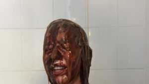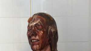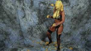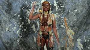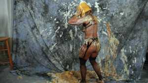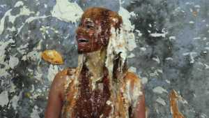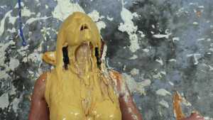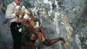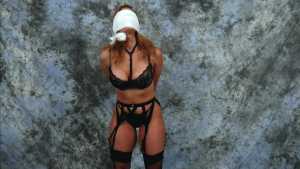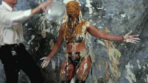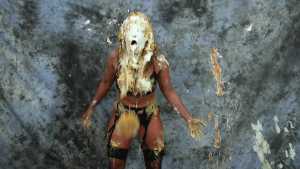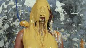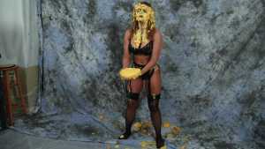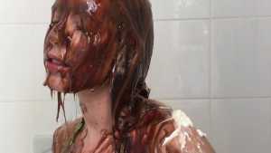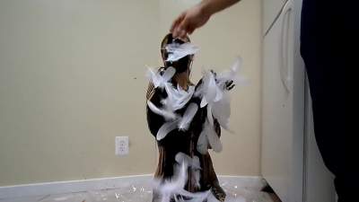 Katrina, wrists bound together and completely nude, gets covered in several bottles of molasses and some large feathers. Starring: | ||||