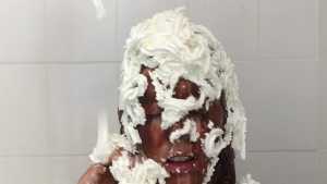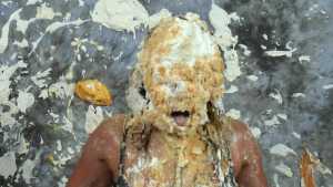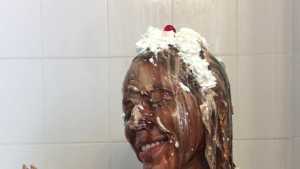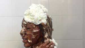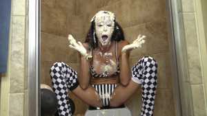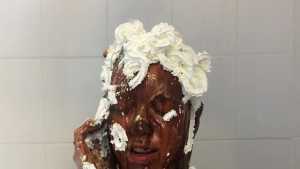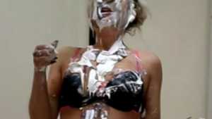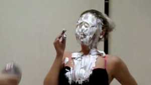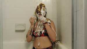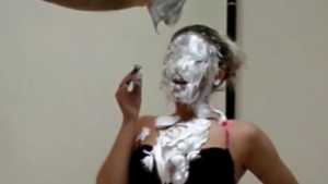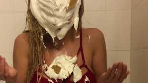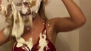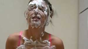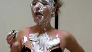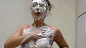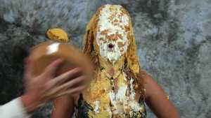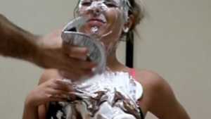 Clad in a red bikini, Sydney gets three pies in the face with real graham cracker crumb and each containing a massive container of cool whip! Then, as the finale, she gets a pie thrown at her boobs!