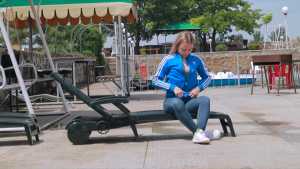 Tanya posed for us dry, then sat on a beach chair, the hot sun was hot, and she thought that this was a great opportunity to get completely wet in blue jeans, a sports jacket, a yellow T-shirt, socks and sneakers!