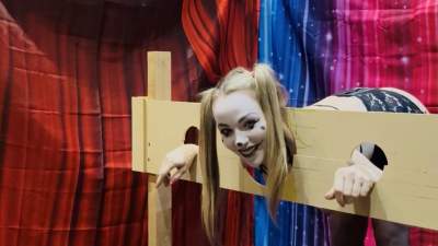 | Naughty Alice gets locked in the pillory and pelted with pies to the face, boobs and bum.