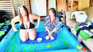 Dressed in matching black Adidas tracksuits, and Hunter boots, Honeysuckle and Maude hose each other down and wash each other's hair with lashings of shampoo, in the Saturatioin Hall gunge dungeons, after a day on the mudbanks.