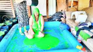 I'm wearing my favorite skinny jeans and covered in gooey slime! It's so shiny! Then I get wet from the shower! Starring: | ||||