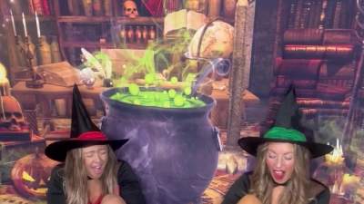 | Bri and Beth are dressed as witches for a Halloween sploshing special.