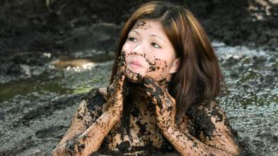 Wearing tight yoga pants and a clingy sports bra, I slowly sink into some thick smelly tidal mud, getting myself a little stuck in the process! I sit down in the gooey mud hole and take off my