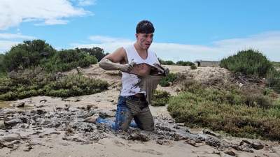 Wetlook in down Jacket and Ripping Outfit Completely!