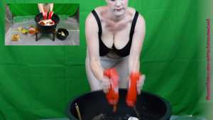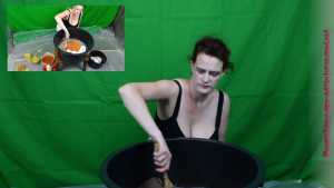 Cleo is wearing a bodystocking and she has a large pot of spaghetti. She wastes no time and drops a handfull of pasta into her cleavage, quickly followed by a second handfull. She keeps adding more, until it starts dropping out of the scrotch of the...