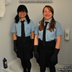 Just released on langstonedale.com - Daphne and Daisy, both dressed in matching Langstonedale Finishing School uniforms of short dark blue skirts, pale blue shirts, black ties, black tights, black rubber gloves, and black lace-up plimsolls, take a shower and bath together, and completely drench each other's clothes in bubble bath too!