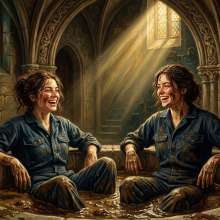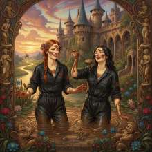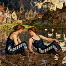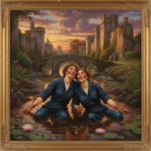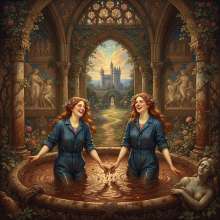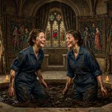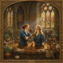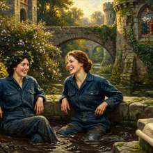 My own favourite classic art period is the Victorian Pre-Raphaelite movement, artists like Edward Burne-Jones and his contemporaries, beautiful images full of detail, allegory, and visual storytelling. Of course in the 19th century painters didn't usually show women in overalls or tracksuits taking mudbaths in gothic bathing chambers, but by the powers of AI, I can now create those kinds of images, in something approximating the Pre-Raphaelite style. I've added a few of my favourite creations below.