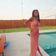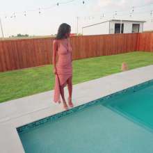 Amy hangs out at the pool on a beautiful summer evening ready for a night out. She is wearing a sexy sparkly evening gown and heels. The water is just looking so nice, so she decides to take a swim in the dress instead of going out. She first shows off her outfit dry and then she goes in the pool and slowly soaks her outfit until it is completely soaked and then she dunks under to also get her hair wet. Whenever she comes out of the water, her dress is very clingy and also you can see it sparkle from the evening sun. She swims underwater plenty of times and she also dives in the pool wearing her dress and heels. Scene contains underwater footage.