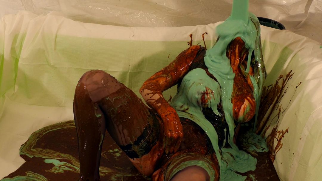 Wearing her finest latex fetishwear, a blind-folded Brooke demands maximum mess, and as ever, Hotwam delivers. Bucket after bucket of mixed up leftovers, thick creamy gunge, and sticky syrup rain down on Brooke in a relentless tide of gunk. Before long she is writhing around in the gunge, frigging herself silly, and begging for more mess!