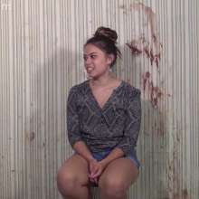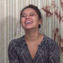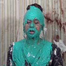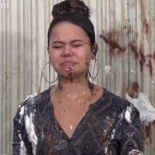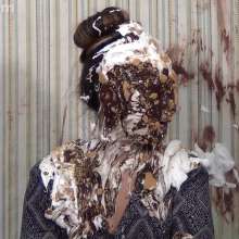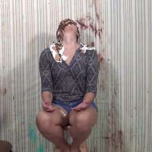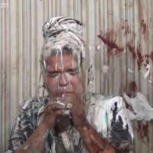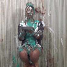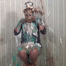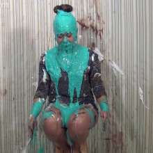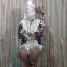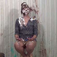 India is back for another great pie scene. She is wearing jean shorts and a lovely summery top. She gets pied from above several times, leaving her totally messy. Water, slime, and several more pies follow! India was such a good sport and she enjoyed getting pied and slimed; such a great sense of humor as well!