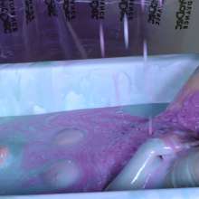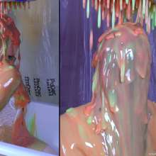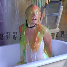 A third full pour of 60 litres is triggered onto her, and she fans her incredible hair out to let a wonderful pastel rainbow of gunge build up on it. She then slips out of her knickers and rolls around in the tub. "This feels so good" she gasps, "I just want to be covered in it". She positions her naked pussy under the gunge flow, and moans "I'm ready". More gunge floods down between her legs, and she starts bucking her hips and moaning. She can't resist this feeing for long, and as she submerges her head and face backwards into the gunge she uses her fingers to make herself cum.