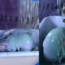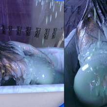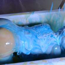 After she's released from her cuffs, she grins and says "surely the machine can't be empty yet?" That's our cue to dump another 60 litres of gunge onto Emilia, this time a wave of blue and white that hits her square in the face. First Emilia pulls down the top half of her outfit, then she leans back onto her elbows to catch as much of the gunge as possible. It's so thick that a layer an inch thick builds up on her face and her chest, her features are obscured but her rock-hard nipples poke through it and give us a clue how much she is enjoying the experience. Moving onto all fours, she pushes her breasts down into the rapidly-filling bath of goo, and then sits up again to play with her hair. It's almost a meter long, and she rubs it across her hard nipples, spreads it out to catch as much gunge as possible, and then drags it across her face.