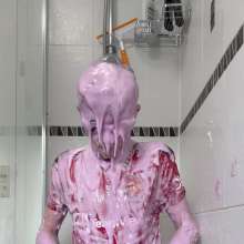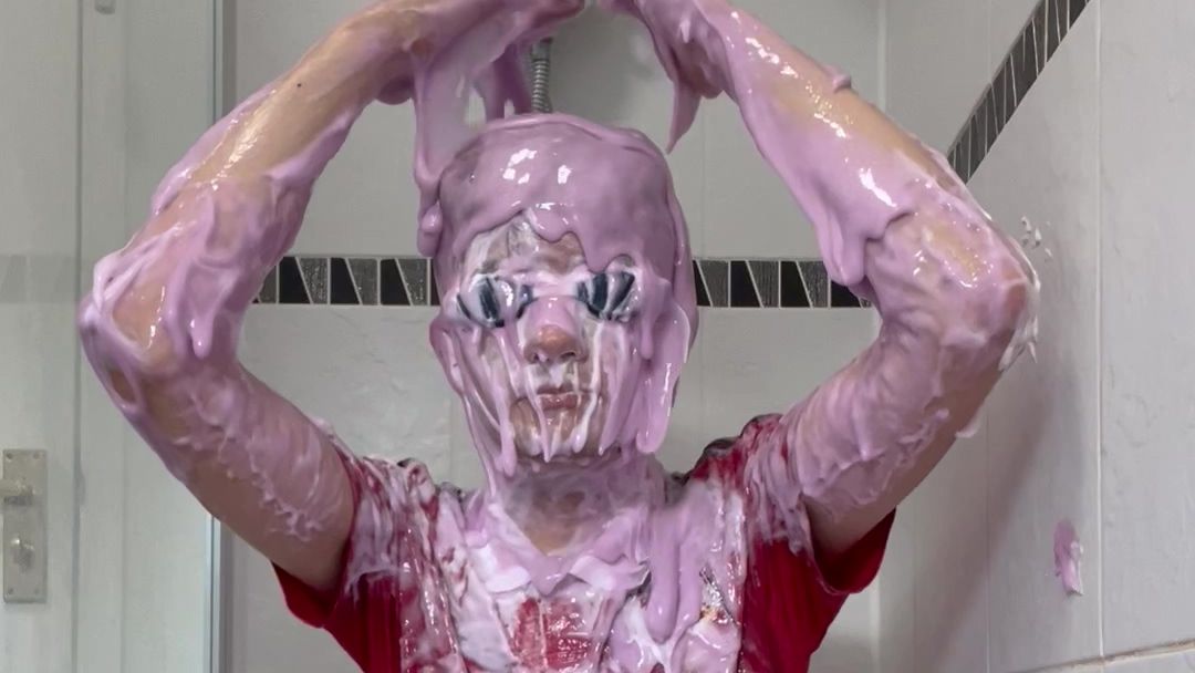 Wearing goggles, a Man Untied shirt and tight shorts I pie myself in the face twice before pouring a whole bucket of purple gunge all over my head! I'm completely covered and love rubbing the gunge all over me.