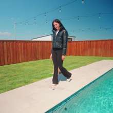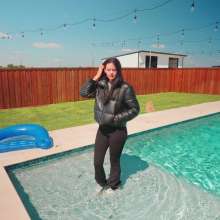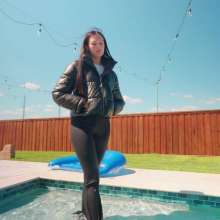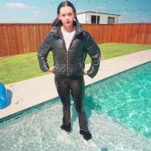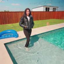 Jenny is sitting by the pool, wearing black yoga pants, a white shirt, sneakers and a puffy leather jacket. She first walks around for a little bit, so we can check out her outfit while dry. She then steps in the pool in the shallow part and goes in knee deep and comes back out again. She gets back in a little deeper and comes back out. She repeats this, going in deeper every time, until she goes all the way in, dunking her head underwater. When she dunks underwater she has a hard time because of her jacket holding air. She comes back out of the pool with her outfit all shiny and her jacket filled with water. After showing off her wet outfit for a little bit she jumps back in. Next she comes out and moves into the hot tub. in there she opens up her jacket and then she walks to the side of the pool and dives back in. She continues to swim in the pool and also using the floatie for a little bit until she comes out and shows off the outfit one more time as the clip ends.