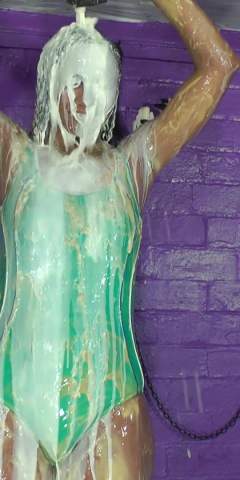 In this video, friends Kelly and Caley come out to play a game of rock-paper-scissors and get messy with lots of condiments. Each round they play, the loser gets doused with a condiment of the winner's choice! The condiments used in this scene are mustard, mayonnaise, ketchup and ranch sauce. These aren't just normal sized containers, they are the extra large containers! At the end of this scene, both of them are covered head to toe in condiments, and in the last few minutes of the scene, they both wrestle each other with mustard.