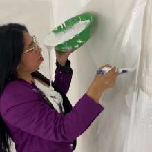 With her head spinning, she doesn't care about her office clothes and focuses on painting.