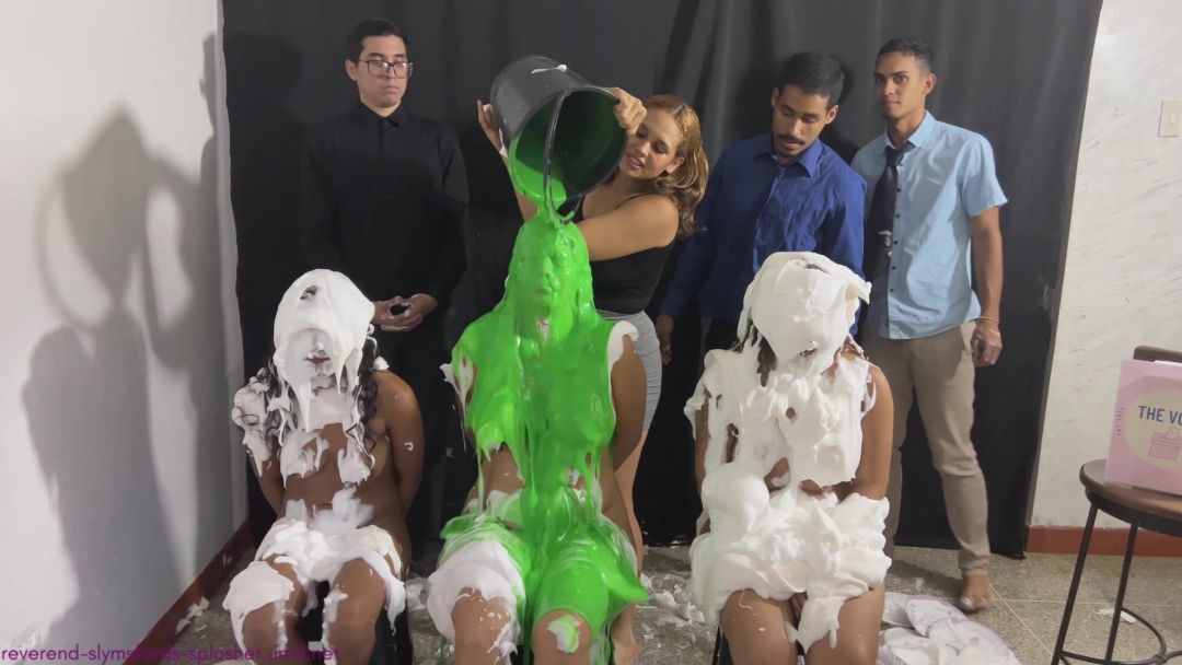 Then Jenny says that she will now reveal, in an unconventional way, whether the two winning girls gambled and so won the cash prize. If they gambled, they made the right decision and have now a chance to receive the money. If they didn't gamble, they made the wrong decision and will receive a bucket of green slime over the head. Jenny explains that if either girl made the right decision and gambled, then "her" bucket of green slime, will instead be received by the losing girl. Jenny then gets some sprinkles, and sprinkles them over the loser's face, before untying the tied girls. Jenny tells the contestants "We will sort out the prize money tomorrow, but for now we should let you shower." We'll be back in the next part We then watch the 2 winning girls showering together, helping each other get clean (no boys are there). Then we see the losing girl shower for one minute... with all 3 Judges watching and ogling. Now we are back on set and Jenny is interviewing the losing girl, asking her how she feels etc. Meanwhile, making the shhhh gesture, the other two girls each enter carrying a large shaving cream pie, and sneak up behind. Seeing what is about to happen, Jenny gets out of the way, and the two girls deliver their pies simultaneously, one from each side (ie a pie sandwich) Don't miss next week's episode.