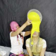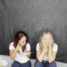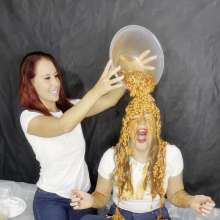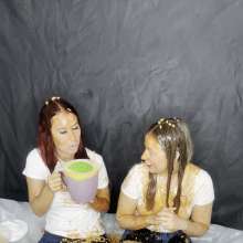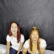 Bri and Jess west go head to head with some a messy trivia quiz around them are some foam pies, colourful custard, beans, rice pudding and gunge. both wearing White t-shirt's, denim jeans, white socks, white trainers.