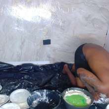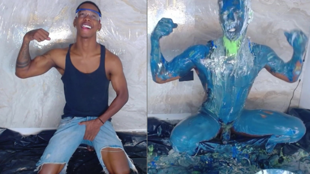 Michael Jordan muscular, radiant, and with the most infectious smile-- brings his full energy to this colorful, chaotic session. He starts by stripping down to keep nothing between him and the mess, then lands a series of playful cake splats right onto his face, laughing as the cream drips. He jerks off over the las cream pie and cums on it, only to smath it on his face afterwards.