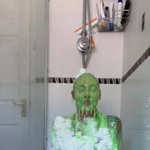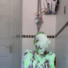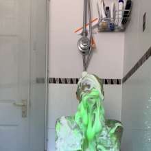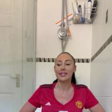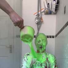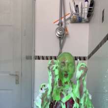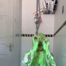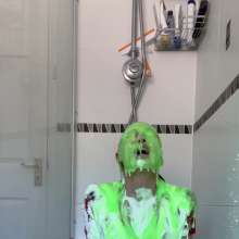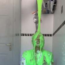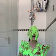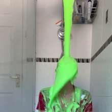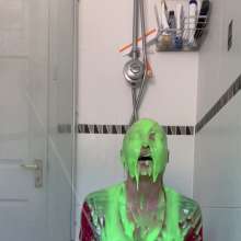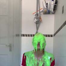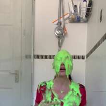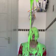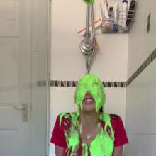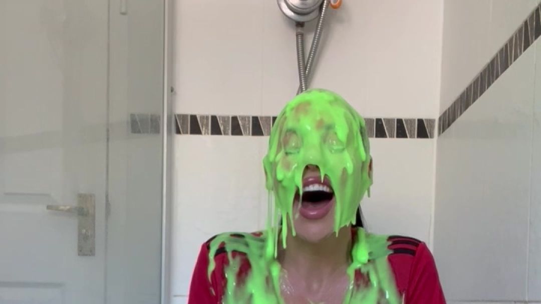 The green gunge falls straight away covering Mila and her Man United shirt, completely ruining it! The gunge keeps coming as Mila gets messier and messier, before a pie goes right in her face!