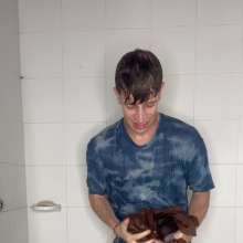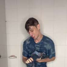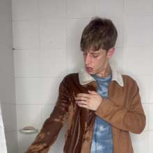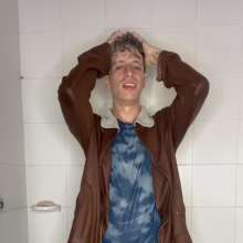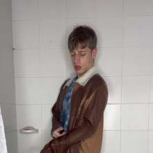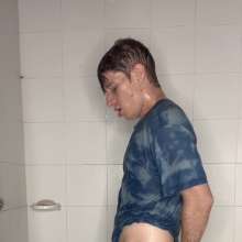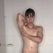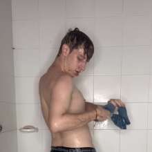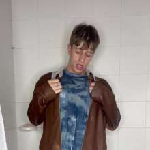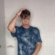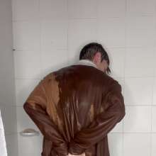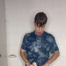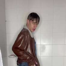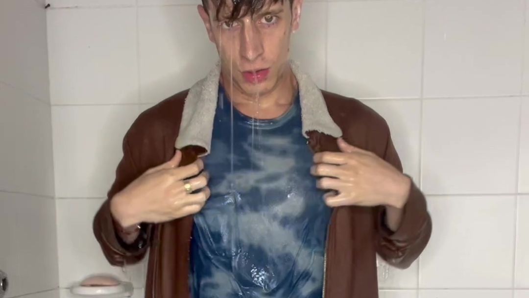 As soon as he gets home, Ostin decides to take a big shower, keeping his jacket on. Underneath, he's wearing a fantastic t-shirt and his jeans. A total soak, his jacket will get super wet, and as soon as he takes it off, his t-shirt he looks super sexy in his wet look, including his gorgeous, soaking-wet jeans!