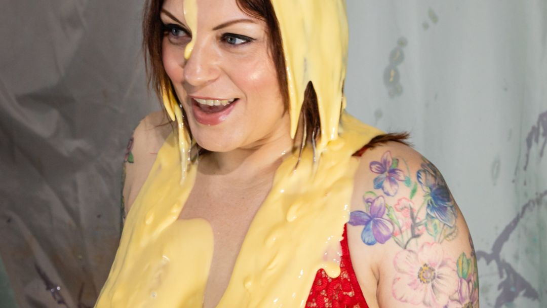 Beautiful large photoset! Amy gets absolutely trashed with mess in her racy red lingerie, stockings and heels! Candy has a load of mess lined up for Amy--pies, custard, yogurt, cakes, flour, syrups and sets about making sure Amy gets her beautiful lingerie, stockings, shoes, make up and hair all ruined by constant deluges of mess and big pie splats. Amy also sits on a cake and gets covered in flour twice, making the mess really gloopy and impossible to remove. Poor Amy! Amy sets her gorgeous tits free from the lacy teddy and Candy just covers those in custard, syup and flour too. Amy gets totally sploshed and trashed!