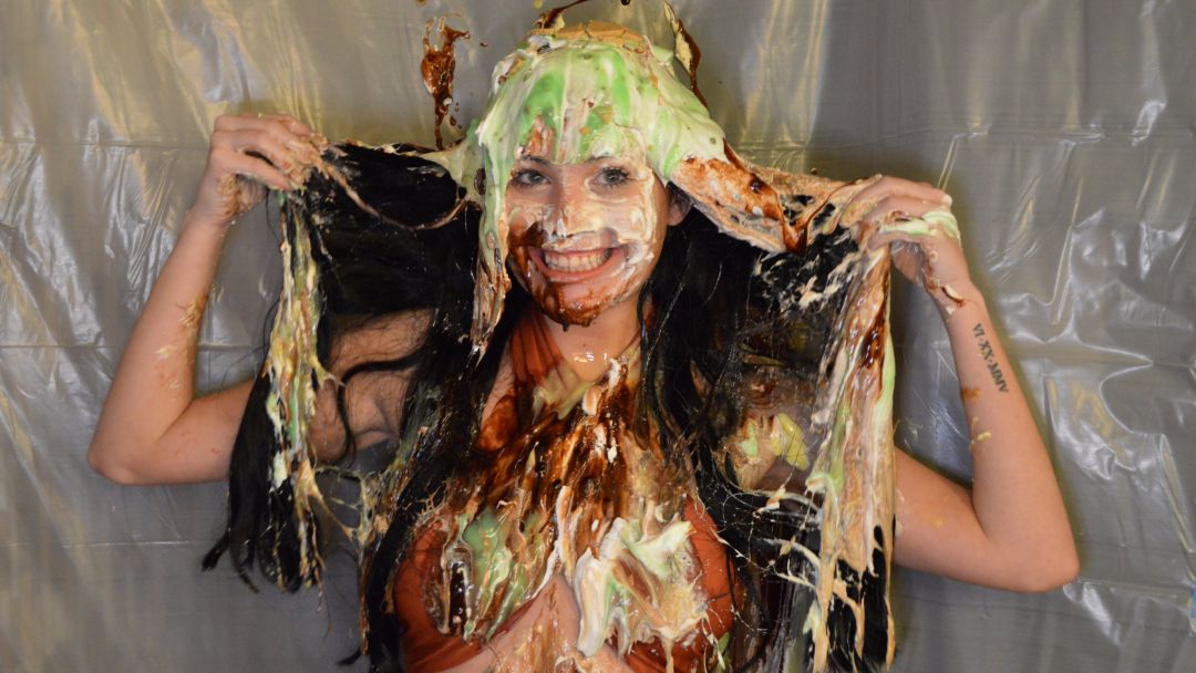 Your favorite new model Sydney is back for more! In this scene, Sydney is wearing her ripped black jeans and a very tiny cro-top, and hops on the stool for yet another trivia challenge. Using multiple flavored pies and many buckets of gooey, colorful slime, it isn't long until Sydney is covered head to toe in mess.