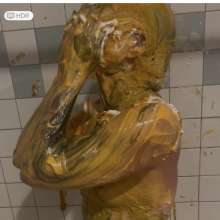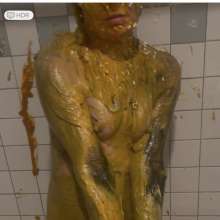 Trixxi covers her body with the goo and makes sure that ass is slippery and wet. Turning around a hand comes to decorate her tits.