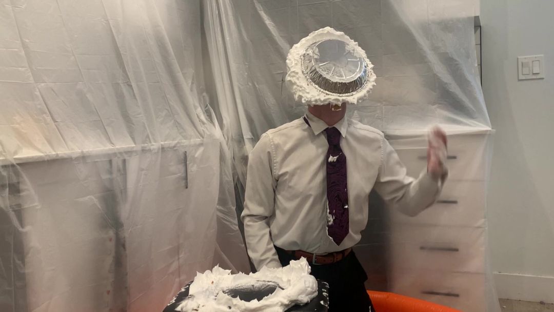 Mike is playing a simple game today, he needs to move pies into a bucket without using his hands. Starting out in just a shirt and his boxers Mike gets his formal trousers on along with a belt and tie. Round One is Mike sitting on the pies and letting them drop into the bucket. Round Two is Mike moving the pies by attempting to get them to to stick to his face. After both rounds are over Mike gets his reward and puts the bucket of foam and crust he has collected over his head before rubbing himself with all the pie mess he can get his hands on.