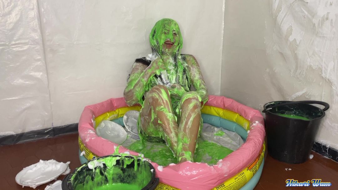 Sofia covers herself from head to toe in slime and cakes, enjoying every detail. She covers her entire body, her T-shirt and shorts, with thick slime and soft, sticky cakes on her face and hair, until she turns into a sexy green monster.
