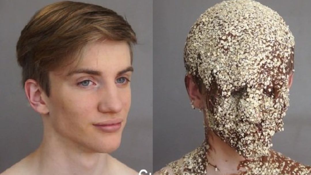 In first, a lot of Nutella is spread all over his face. The chocolate creates a brown mask all over his face.Then, some oatmeal is added.