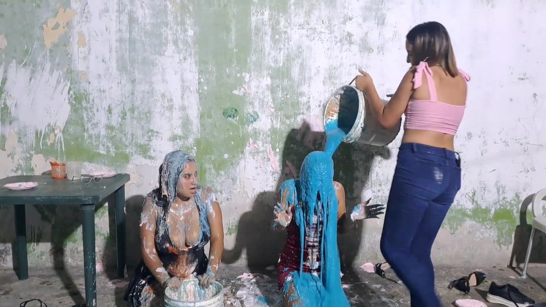 Subtitled for your viewing pleasure. When Patricia catches Clara and Norma trashing Steve, she explains to them that he isn't Rev. Patricia sympathises with Steve who can't see anything as his face is covered in pie, but naughty Patricia can't resist pieing Steve in the face and blames Clara. Patricia threatens to call the police on Clara and Norma unless they accept a reciprocal punishment, So Steve leaves and Patricia sets about pieing and sliming Clara and Norma, including making them pie each other. She then makes them head dunk in big buckets of slime... she pushes their heads right in, using her hands... and then her feet.
