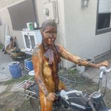 Nuts and bolts were frozen on with rust so Trixxi grabs a bottle of motor oil to loosen them up. The plan was great but oopsie she spills some on her hands. There's that slick sweet oil feeling again, may as well switch it up and have some fun instead. Bike can just wait!