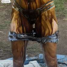 This can only get better and better! Getting fresh bottles of the dark slick glop, Trixxi turns around and pours it down her back covering her tattoo and it glides onto her ass. Still covered in her clothes wow feels delicious. Time to strip off those shorts and drop a whole bottle down her backside! Smooth and slick all over her ass checks. Motor oil delight. It's dripping through her bikini bottoms her ass and and pussy totally soaked now. Smothered titties happy and sticky too!