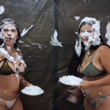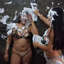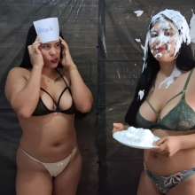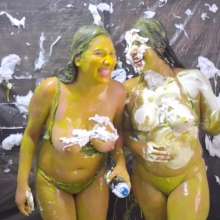 Get ready for a half hour of non-stop laughs and mess as two girls in swimsuits play a hilarious game of Charades. Every time they make a mistake, they get a creamy shaving foam pies, leading to plenty of giggles and messy moments. But the fun doesn't stop there--next up is a wild round of Hangman, where each wrong letter results in more pies to their face, tits and ass. With each misstep, the girls are covered in even more foam, creating a chaotic and hilarious scene.