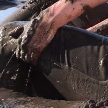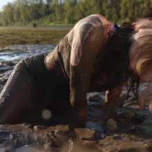 Two parties into the late evening, Lavender sets across the beach before sunrise, in her silver, retro disco pants and pink bralette. The beach has another surprise for her--it is not quite as solid as it seems. She begins to sink! Amused at first, she quickly gets disgusted by the mess. She struggles and twists, sinking all the way to her shoulders. As the sun rises, she gathers the strength to pull herself out into the chilly, early autumn air. Fans of a prolonged extraction from real quicksand will take great delight in the strenuous effort she puts into pulling herself out.