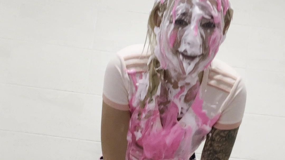 Beth is back and she's ready to get super messy! She starts with a pink pie right in her face, before squirting the foam all over her body, getting messier and messier!