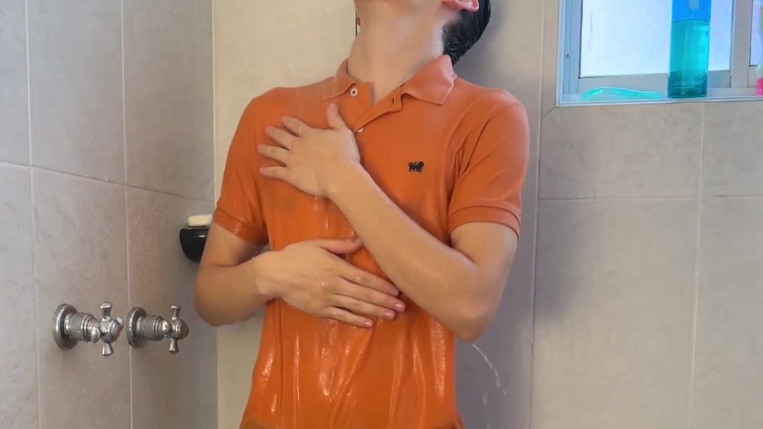 LiamB takes a gorgeous shower wearing an orange polo shirt and jeans. He's seductive and gorgeous while he's getting wet, and fabulous and fun while he's shampooing. After rinsing off the suds, he offers us a spicy finale! Sexy!