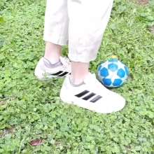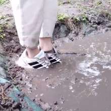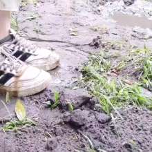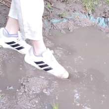 Wearing sneakers and socks I play around kicking a ball and then slowing stepping into dirty muddy water, doing some sneakers and sock play.