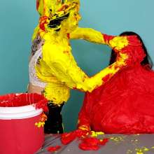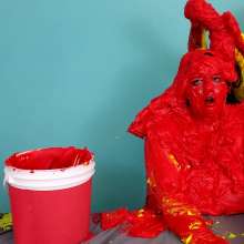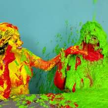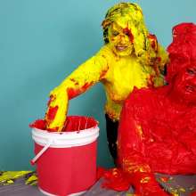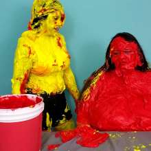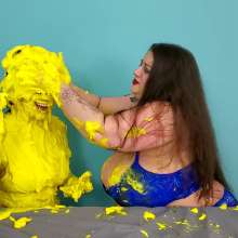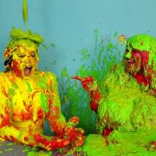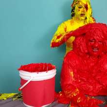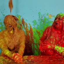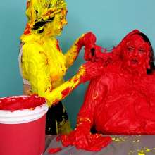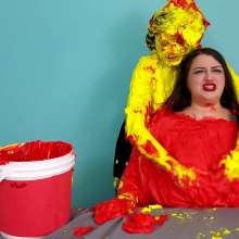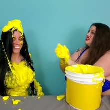 The Wife and Nosha are on set and showing off their new bras! However, Nosha has some news. She states that The Man gave her permission to get The Wife messy in any way she pleases. And what did Nosha choose for her method of mess? Why 15 pounds of buttercream frosting of course! With glee, Nosha slowly spreads all 15 pounds of heavy buttercream. She covers the arms, stomach, face, and breasts of The Wife, but really makes sure to get it thoroughly in her face and long hair. Not to be outdone, The Wife reveals that she too has a 15 pound bucket, and it's filled with bright red buttercream frosting. She uses it to cover Nosha's arms, face, and breasts... however, Nosha has some very large breasts. So, it takes The Wife an ample amount of effort and buttercream to cover them. By the time she's satisfied with her work, there isn't enough buttercream for Nosha's hair! That is, until Wife shows that she has an entire second 15 pound bucket of bright red buttercream frosting! She uses this second bucket almost exclusively on Nosha's hair, making sure to work it in at every possible angle. After 45 total pounds of buttercream between these two girls, what else could possibly happen? Two chunky green slimes, that's what! Not to mention someone had to get a recycled sliming.