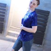 Mistress Splash wears blue on blue with a bright blue t-shirt and blue jeans as she soaks herself in the shower and hot tub.