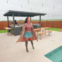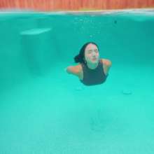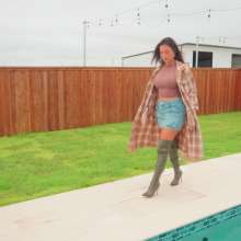 Iris is by the pool on a cool day wearing a denim skirt, a crop top, long flannel shirt and and over-knee boots. She first walks around a little bit to show off her outfit dry. She then steps in the shallow part of the pool, partially soaking her boots. She takes her time before she steps in deeper to mostly soak her outfit, while her hair is still dry. Next, she comes out of the pool and then she walks to the deep end and jumps in, to completely get wet. She is swimming around for a while until she takes her flannel shirt off. Later she also takes her boots off, to swim barefoot for a little bit. After the barefoot swim, she comes out to check her phone and then she cleans the kitchen for a little bit before taking a final dip in the pool. Scene contains some nice underwater shots.