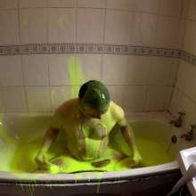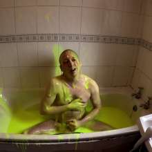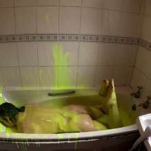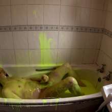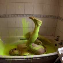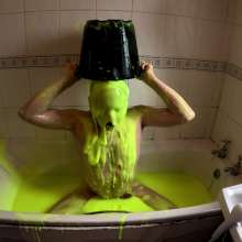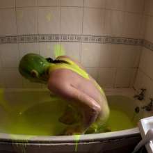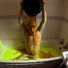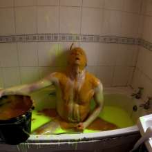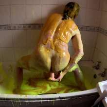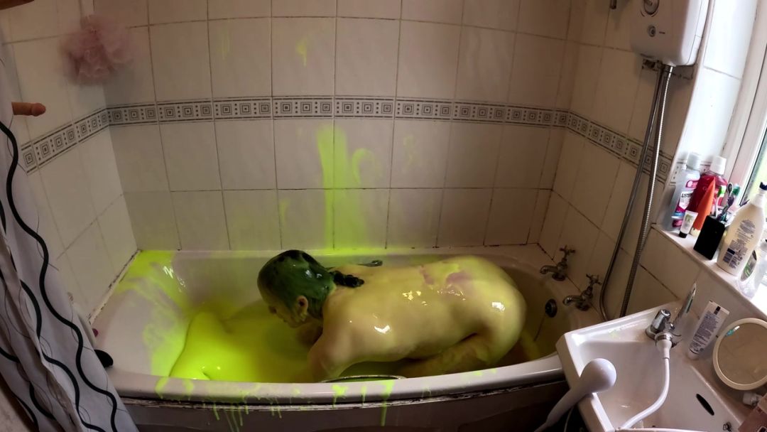 He continues to play in the gunge, pouring it over his head, and then lying face down in the bath. He adds another bucket of super thick gunge, before fucking himself with a dildo.