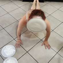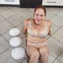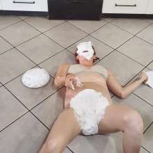 Taking pies to the face, pie sitting and crotch pies in humiliating ways while wearing huge panties and a bra.