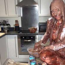 Stepford wife is busy trying to make brownies for the bake sale, everything has to be pristine as usual and for some reason she thinks it's a good idea to do this wearing White. She very quickly splats herself, tries to fix the mess and ends up slipping and face planting a tray of fresh brownie batter... will she ever learn? The Brownies end up ruined and she has nothing for the bake sale so ends up trashing herself and masturbating in the chocolate mess.