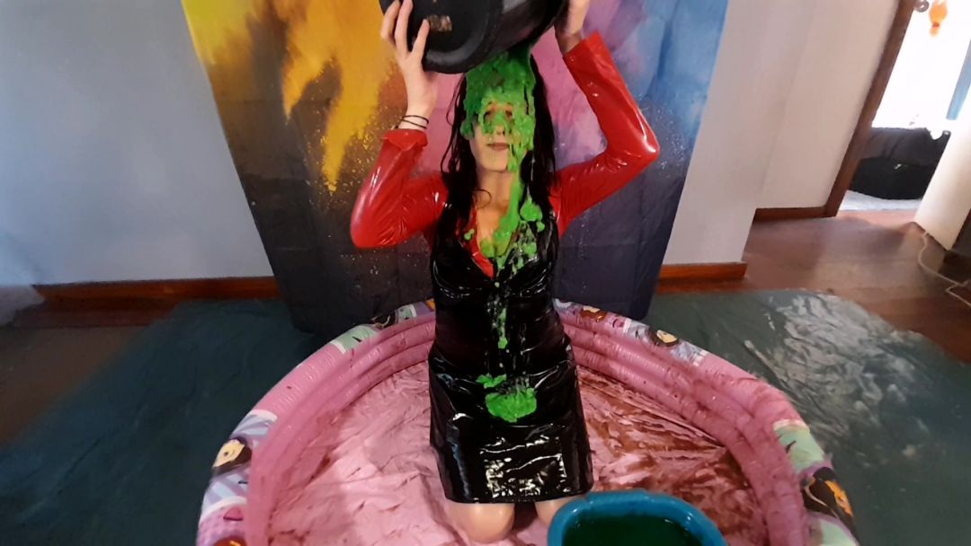 In my living room, the red and black PVC dress gleamed, hugging my curves with a glossy sheen. Craving chaos, I grabbed two buckets brimming with green slime. With a grin, I poured the first over my head, the gooey cascade coating the dress, dripping messily onto the floor. The second bucket followed, splattering wildly, turning the sleek PVC into a sticky, vibrant mess. I twirled, laughing, the slime-soaked dress clinging to me, a gloriously messy masterpiece indoors.