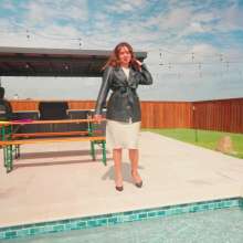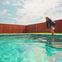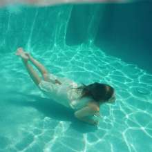 Samantha is walking around poolside wearing a sexy white dress, heels and a leather coat. She first shows off her dry outfit. She then steps in the pool fully-clothed waist deep, before she comes back out and dives in the pool. Now all soaked, she comes out off the pool to show off her wet outfit. Next she steps in the hot tub for minute for some more soakings. She comes back out and goes back in the pool. After she comes out again, she takes her jacket off and goes back in. For the rest of the clip she dives in again and she also has to go under to retrieve her jewelry which she lost while diving in. At the end of the clip she also takes her heels off and swims barefoot for a little bit. Scene contains underwater footage.