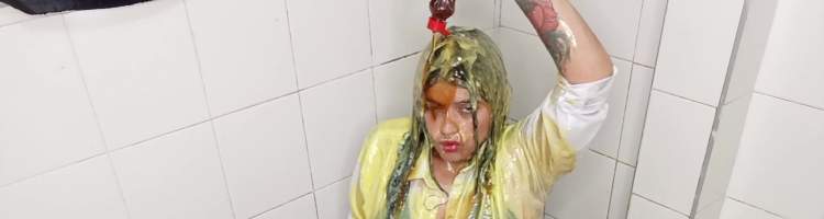 Stunning Cleo Summers is gunged in a full formal outfit including dress, hat, lingerie, shoes plus stockings and suspenders. Cleo looks amazing in her outfit, she's got all dressed up thinking I'm taking her to Ladies Day at the local races. Turns out of course that I meant Gungey Ladies Day at the local gungetank... easy mistake to make. So Cleo in her formal outfit including expensive black dress and black high heels, gorgeous black lacy lingerie and stockings, a posh hat and handbag gets into the gunge tank and tries her best at a gunge quiz. Her bf Luke is setting the questions on this one, and I get the feeling he may have rigged it slightly as revenge for when she set the questions in his gunge game. Poor Cleo's outfit gets totally wrecked with multiple gungings for wrong answers. Cleo also strips as some of the forfeits and is mercilessly gunged in every state of undress. The gunge looks spectacular coming through the hat by the way! Eventually Cleo is nude and gunged some more, and she begins to find the sensations distracting, the slime oozing over her fantastic body sets her off and she masturbates to orgasm in the tank, getting gunged again when she cums. Includes overhead cam footage!